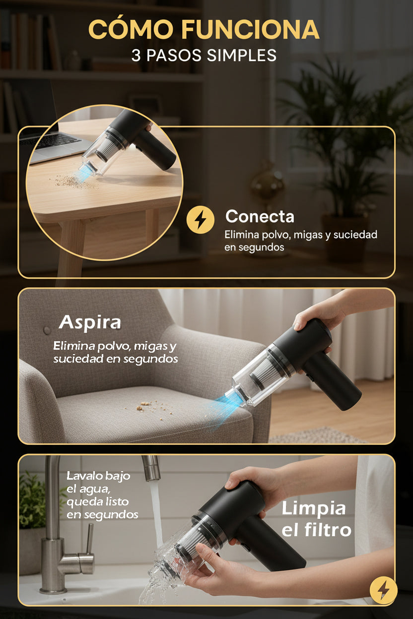 - Tipo: Mini aspiradora inalámbrica portátil